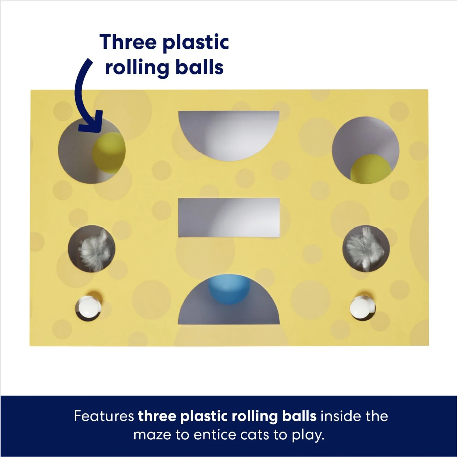 - Two plush mice pop up from the topside holes and three plastic ball toys roll around inside, offering an irresistible multisensory temptation to play.